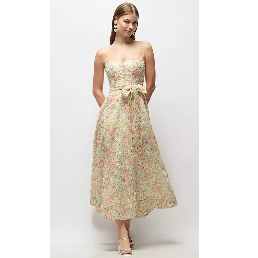 Dessy Group: Floral Re-Embroidered Voile Boned Corset Midi Dress